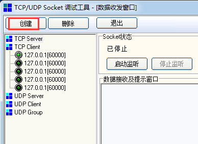 1) 點(diǎn)擊左方的TCP Server, 然后點(diǎn)擊”創(chuàng)建”按鈕,