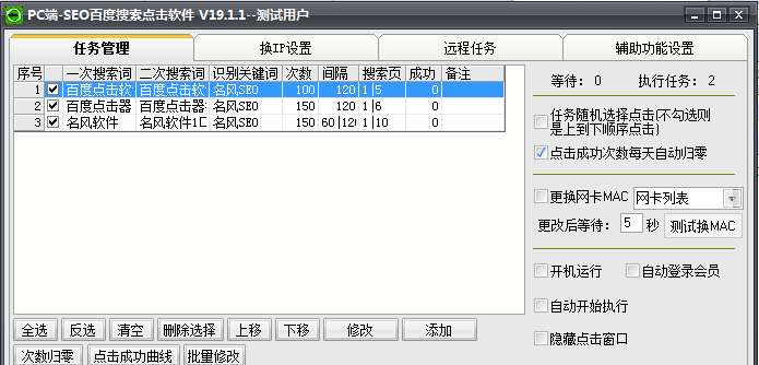 風(fēng)SEO關(guān)鍵詞優(yōu)化工具是一款可以提升網(wǎng)站排名權(quán)重,完全模擬人工點(diǎn)擊在搜索引擎中搜索關(guān)鍵詞,內(nèi)置ADSL拔號(hào)可以自動(dòng)更換ip地址,同時(shí)它采用了針對(duì)搜索引擎進(jìn)行模擬化人工操作,絕對(duì)有效的提升關(guān)鍵詞排名。這款SEO優(yōu)化工具包含了多關(guān)鍵詞輪流搜索點(diǎn)擊、關(guān)鍵詞2次搜索、時(shí)間段點(diǎn)擊設(shè)置、2次客戶(hù)網(wǎng)站頁(yè)面隨機(jī)點(diǎn)擊等功能,能夠讓你的企業(yè)網(wǎng)站的知名度明顯得到提升,歡迎有需要的名風(fēng)SEO優(yōu)化軟件的用戶(hù)前來(lái)獲取哦!