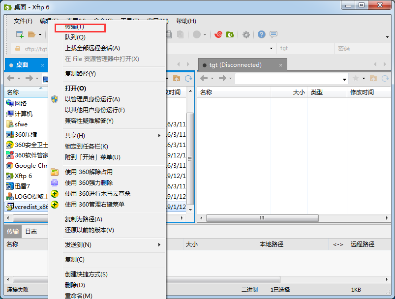 4、在左側(cè)點擊鼠標(biāo)右鍵,在彈出的選項中點擊傳輸。