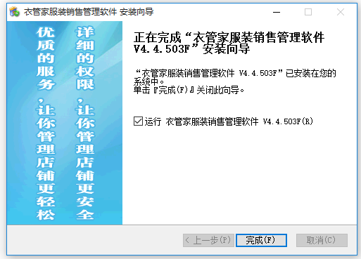 “衣管家服裝銷售管理軟件V4.4.503F”正在安裝,請等候...