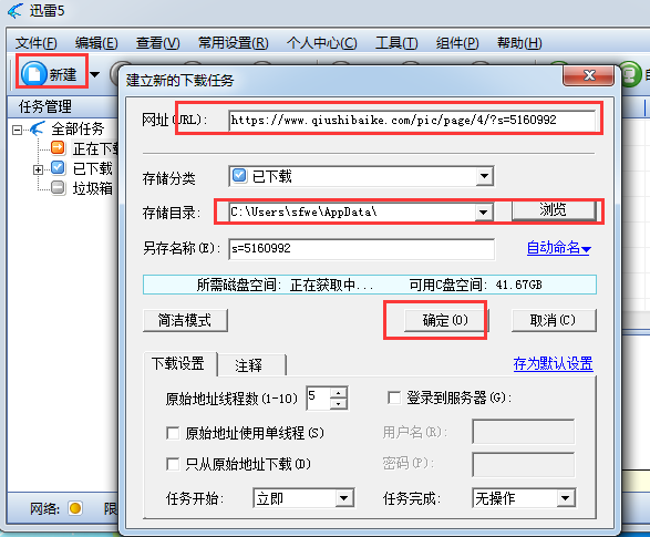 2.輸入網(wǎng)址,設置存儲目錄等信息,完成后點擊確定即可