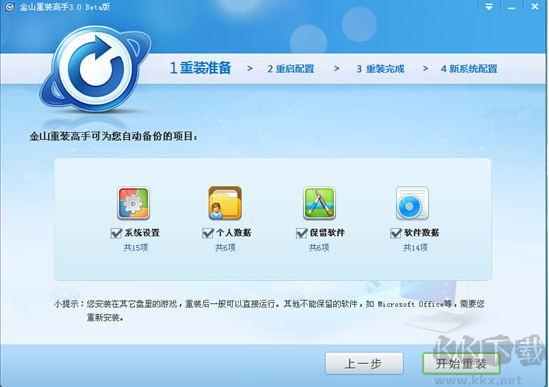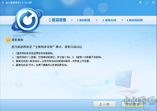 5、點(diǎn)擊"開始重裝"(重裝系統(tǒng)過程中,電腦會(huì)自動(dòng)重啟3次,不要緊張哦!重啟完成后會(huì)自動(dòng)進(jìn)入您的桌面,電腦重啟后進(jìn)入桌面,自動(dòng)啟動(dòng)金山重裝高手,進(jìn)行數(shù)據(jù)還原(系統(tǒng)設(shè)置、驅(qū)動(dòng)、可保留軟件和對(duì)應(yīng)的數(shù)據(jù))。