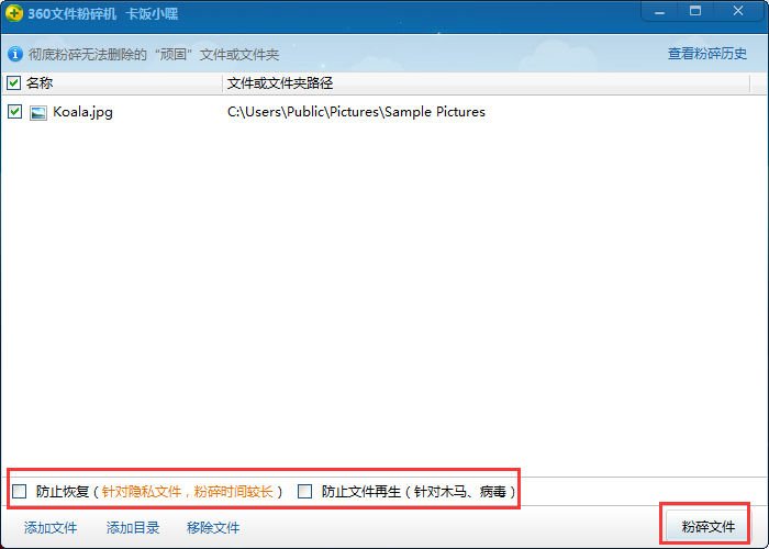 3.點擊“粉碎文件”。在選擇粉碎前還可以勾選防止恢復(針對隱私文件,粉碎時間較長)、防止文件再生(針對木馬、病毒),勾選后粉碎更徹底,不會恢復不會再生。
