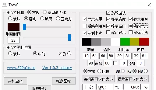 TrayS-CPU32位/64位中文綠色版是一款可以幫助你查看電腦狀態(tài)信息的工具電腦必裝神級(jí)工具。有了這款軟件就可以即可查看硬件溫度也可以美化電腦,使用這款軟件可以透明/調(diào)色/磨砂/亞克力等界面設(shè)置,占用內(nèi)存小,通過(guò)這款軟件可以輕松的查看顯示總流量,顯示溫度,顯示利用率,CPU使用率顯示等信息就,歡迎有需要的用戶(hù)前來(lái)獲??!