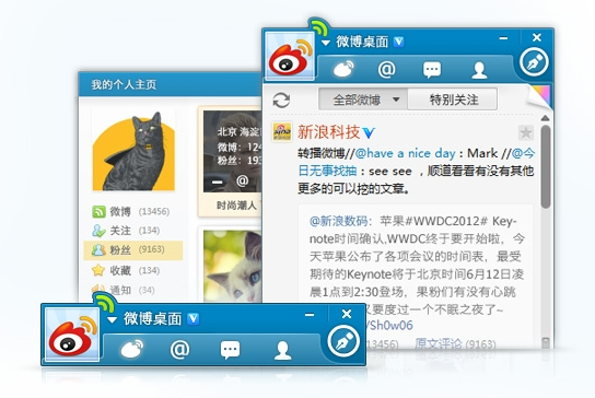 新浪微博桌面是新浪為旗下的微博用戶朋友們打造的一款適用于計算機中使用的基本將Web版微博的功能全部搬到桌面上并進行了優(yōu)化后的桌面版新浪微博客戶端。這款微博桌面除了可以查看微博之外還支持IM即時通信功能,支持在線終端顯示,好友列表分組瀏覽。新浪微博桌面客戶端采用C++開發(fā),速度流暢,不怎么占用空間,是一款適用于Windows操作系統(tǒng)的微博客戶端,歡迎有需要的用戶前來獲取!