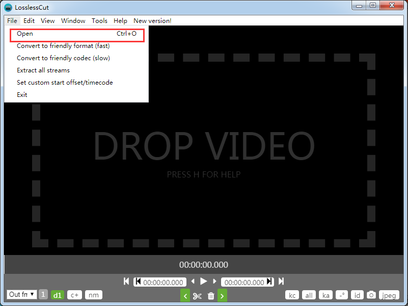 1、LosslessCut Windows版采用GUI界面,無需安裝,點擊“LosslessCut.exe”即可運行,選擇【File】—【Open】,導入需要處理的目標文件