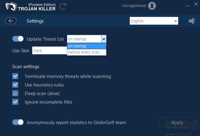 通過管理 Trojan Killer 中的設(shè)置,您可以更改程序界面的語言和顏色等常規(guī)設(shè)置,并對(duì)下一次掃描的運(yùn)行方式制定附加規(guī)范。要打開設(shè)置,請(qǐng)單擊設(shè)置圖標(biāo)。