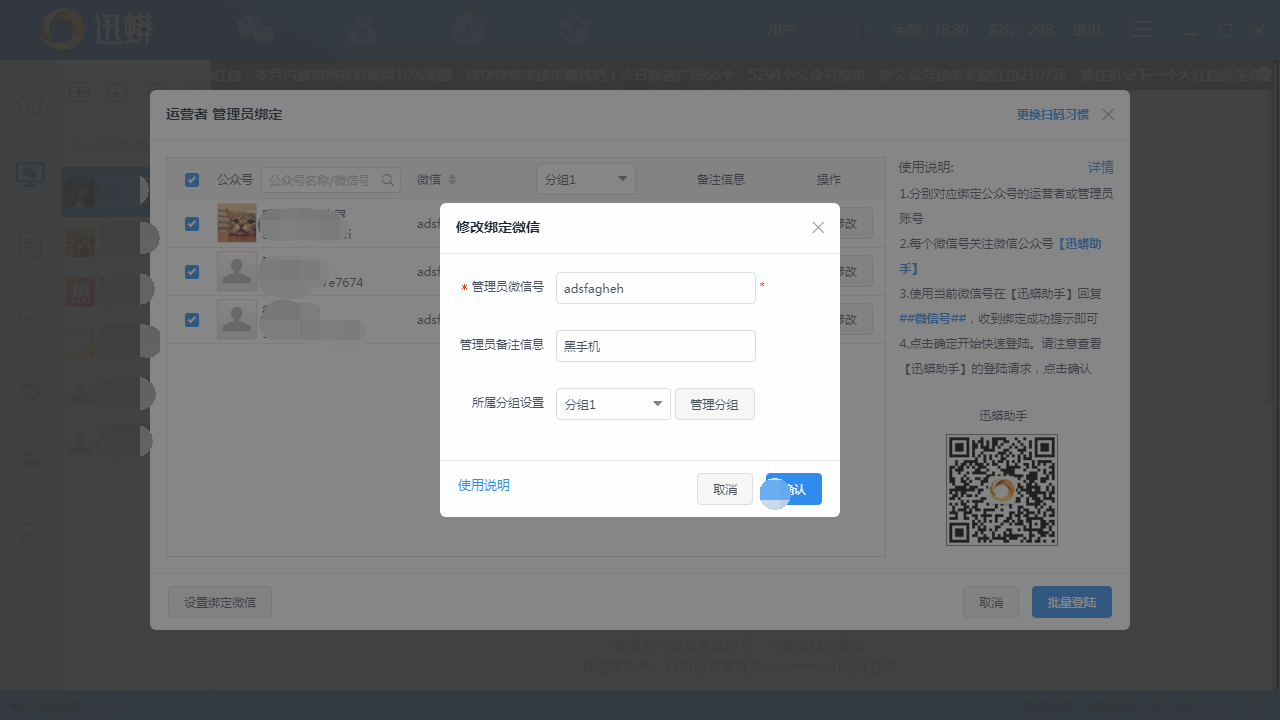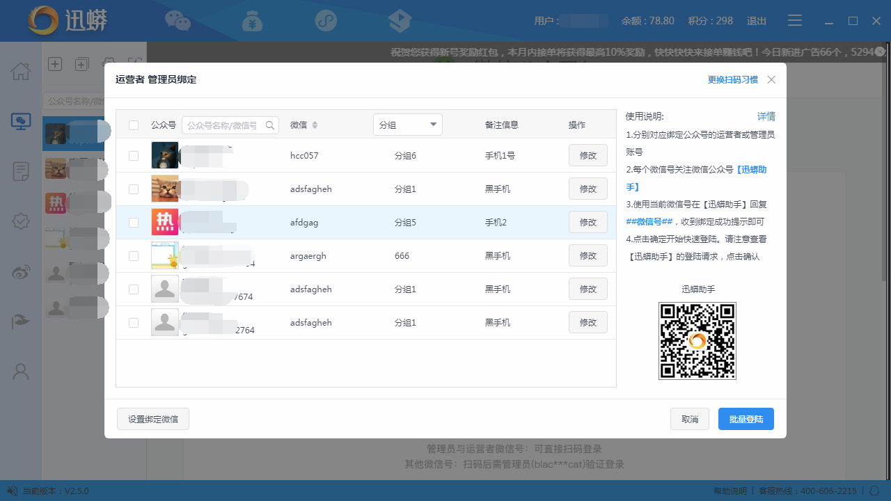 1.選擇需要批量登錄的公眾號,可以單選或者多選。單選直接選擇每個公眾號后的“修改”按鈕,批量請在勾選完之后點擊下方的 “修改綁定微信”。