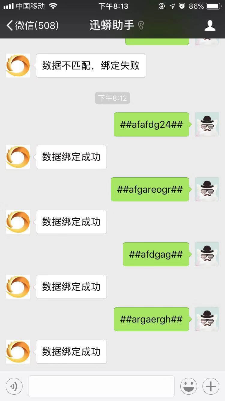 2.用該微信,在【迅蟒助手】回復(fù)##迅蟒賬號,迅蟒密碼##,微信號顯示綁定成功,前期的設(shè)置步驟就完成了。(需提交后2小時內(nèi)到手機端綁定)
