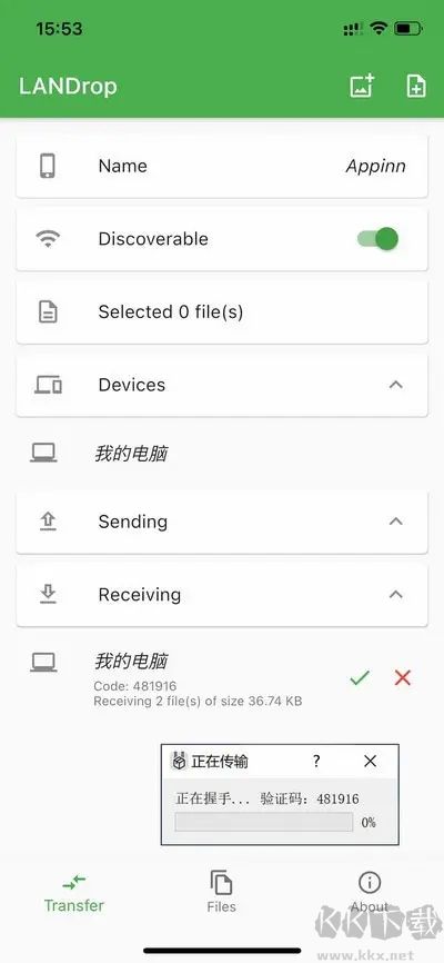3、最后一步,LANDrop 會(huì)出現(xiàn)一個(gè)驗(yàn)證碼,需要接受端設(shè)備確認(rèn)才開(kāi)始正式傳輸文件: