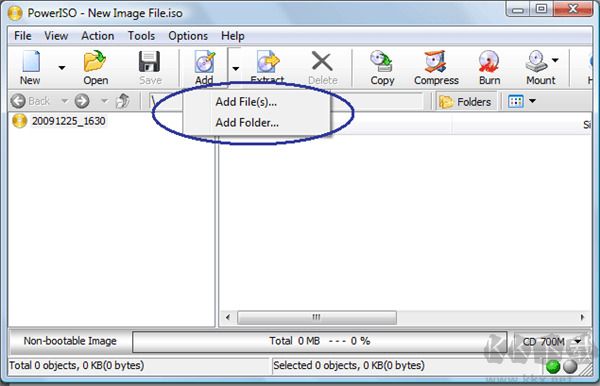 2、按下工具欄上的“增加”按鈕,將文件和文件夾添加到ISO文件中來。您還可以直接將文件或文件夾從資源管理器中拖動(dòng)到PowerISO主窗口中。