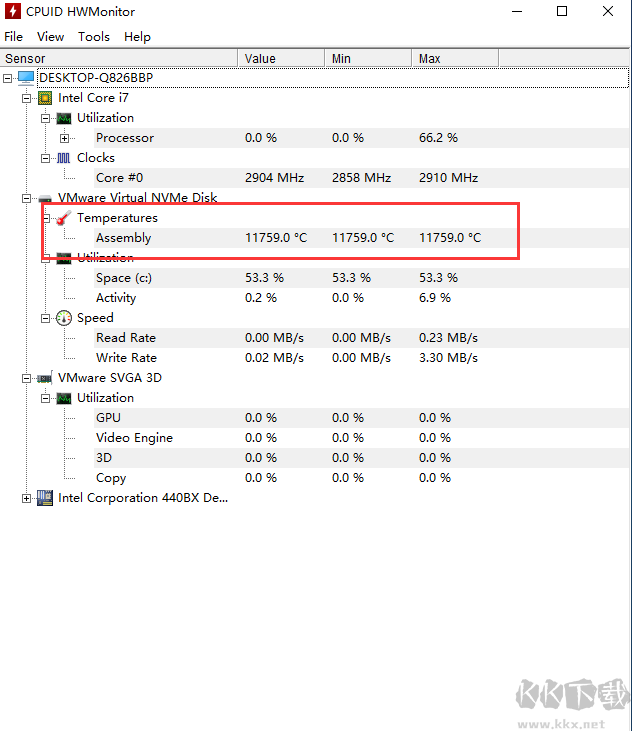 4、通過圖示紅色一欄可以看到CPU的溫度,一般看第一欄Value就可以了,第二、第三欄目是溫度波動的最小值與最大值;