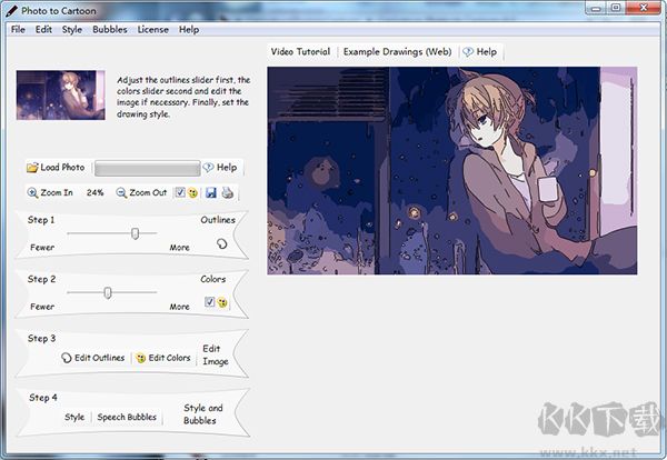 Photo To Cartoon(照片轉(zhuǎn)漫畫工具)是一款實(shí)用的照片轉(zhuǎn)漫畫軟件,操作簡單,不需要專業(yè)素描技巧,就能讓照片呈現(xiàn)漫畫效果。自帶圖片編輯功能,可以對導(dǎo)入的圖片調(diào)整顏色、修改輪廓,還能選擇心儀的漫畫風(fēng)格進(jìn)行轉(zhuǎn)換,轉(zhuǎn)換后畫質(zhì)清晰。軟件還能將照片制作成富有藝術(shù)感的信件、賀卡等,功能強(qiáng)勁而且占用內(nèi)存小,很適合用來制作精美效果圖。需要的朋友快來下載試試吧!