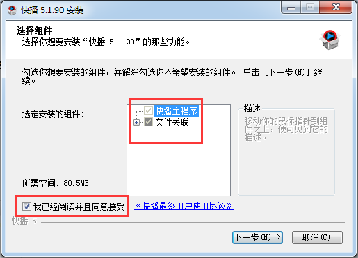 1.到本站下載安裝快播,打開安裝程序,選擇安裝組件,勾選同意接受協(xié)議