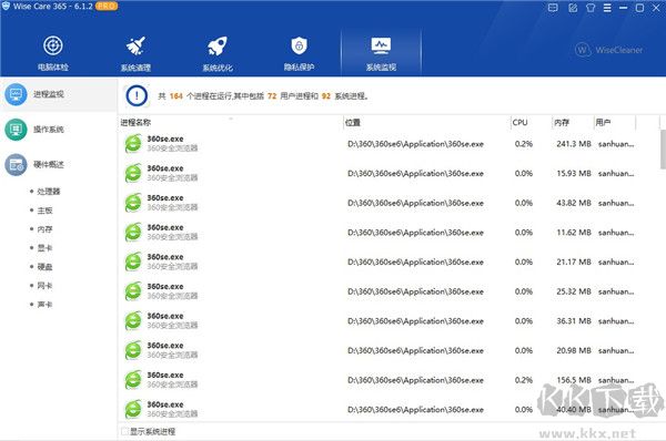 可監(jiān)視進(jìn)程,并查看硬件的處理、主板、內(nèi)存、顯卡、硬盤、網(wǎng)卡和聲卡等信息