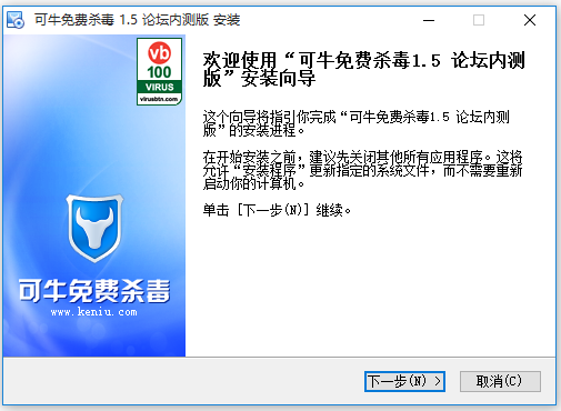 下載可牛殺毒軟件,歡迎使用“可牛免費(fèi)殺毒1.5論壇內(nèi)測(cè)版姿裝向?qū)?,單擊〔下一?H)]維續(xù)。