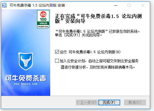 安裝完成,成“可牛免費(fèi)殺毒1.5論壇內(nèi)測(cè)版安裝向?qū)В?/p>