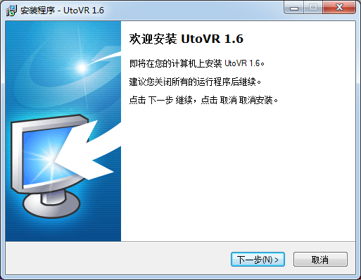 1.歡迎安裝UtoVR 1.6即將在您的計(jì)算機(jī)上安裝 UtoVR 1.6。建議您關(guān)閉所有的運(yùn)行程序后維續(xù)。點(diǎn)擊下一步繼續(xù),點(diǎn)擊取消取消安裝。
