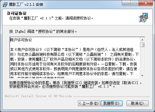 在安裝“魔影工廠(chǎng)v2.1.1”之前,請(qǐng)i閱讀授權(quán)協(xié)議。