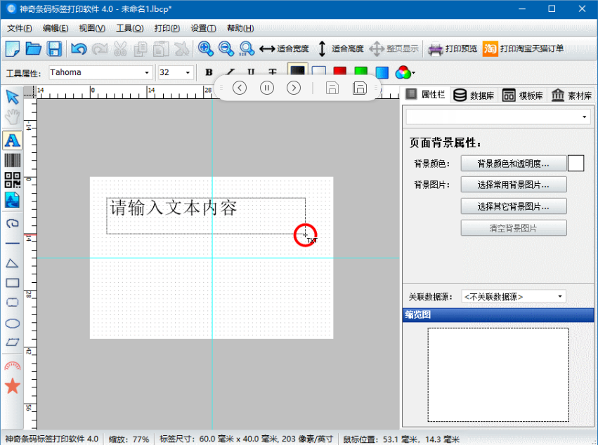 點(diǎn)擊左側(cè)的普通文本按鈕,鼠標(biāo)會(huì)變成一個(gè)小小的“+txt”,在“標(biāo)簽內(nèi)容編輯區(qū)域”拖動(dòng)一段距離,即可創(chuàng)建一個(gè)文本輸入?yún)^(qū)域。