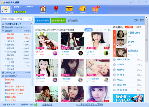 安裝完成后進(jìn)入9158視頻社區(qū)客戶端平臺(tái)。界面如下圖。之后每次升級(jí)只要您點(diǎn)擊進(jìn)入房間,CC就會(huì)為您自動(dòng)升級(jí),你所要做的,就是選擇電信或是網(wǎng)通服務(wù)器來下載。