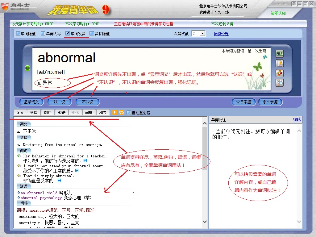 我愛(ài)背單詞軟件(記單詞軟件)在凝結(jié)了社會(huì)心理學(xué),認(rèn)知能力學(xué),應(yīng)用語(yǔ)言學(xué)多課程科研成果的根基上,綜合性完成了“智能化艾賓浩斯即時(shí)動(dòng)規(guī)記憶方法”。我愛(ài)背單詞軟件(記單詞軟件)是一個(gè)相對(duì)高度自動(dòng)化的記憶力數(shù)據(jù)管理系統(tǒng),能即時(shí)剖析人的大腦記憶力的轉(zhuǎn)變?nèi)^(guò)程,動(dòng)態(tài)規(guī)劃人性化的最佳學(xué)習(xí)培訓(xùn)記憶力次序,進(jìn)而實(shí)現(xiàn)更強(qiáng)學(xué)習(xí)效率。用此方式背單詞,您徹底不要操勞每日該學(xué)什么單詞,備考什么單詞,只需跟隨軟件分配的學(xué)就可以了!并且沒(méi)有強(qiáng)制的方案要求,您隨時(shí)隨地都能夠想學(xué)入學(xué),想停就停,而并不會(huì)危害學(xué)習(xí)效率!。