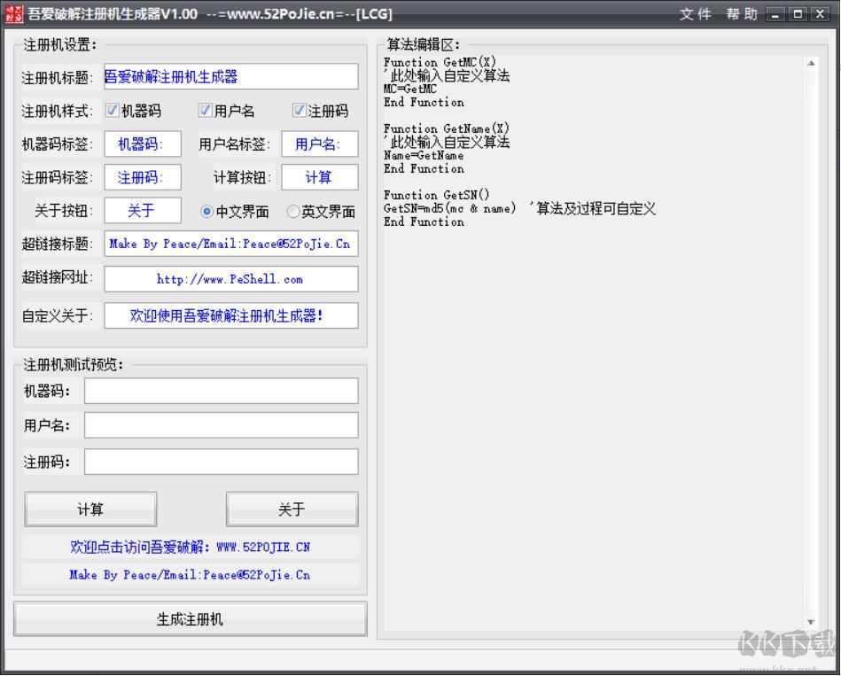 吾愛破解注冊機(jī)生成器是一款用于生成軟件注冊機(jī)的工具,簡單的說,你們需要的注冊碼需要注冊機(jī)來生成,而注冊機(jī)可以利用這個(gè)軟件來生成,簡單明了。主要用于研究軟件注冊原理學(xué)習(xí)使用。