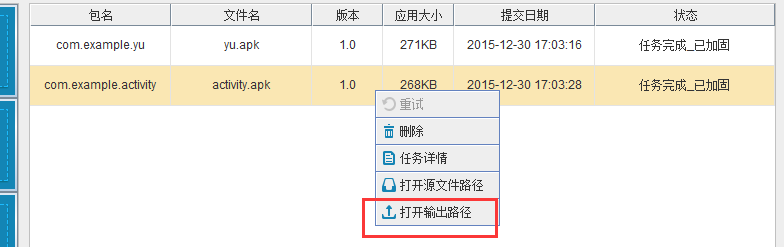 也可在列表里選中任務(wù),右擊鼠標選擇“打開輸出文件所在路徑”。系統(tǒng)將自動打開APK輸出路徑。