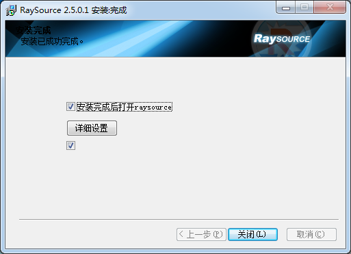 3、安裝成功,點擊【關(guān)閉】立即運行raysource
