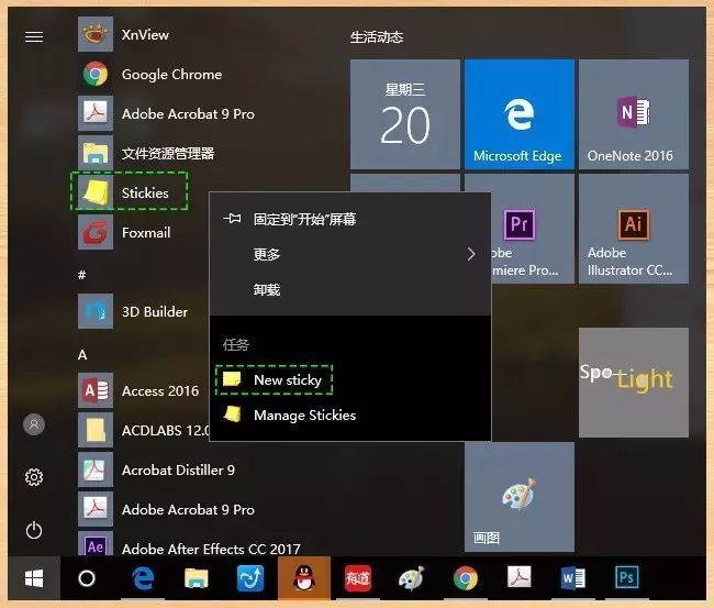 首先,新建一個便簽。方法(如下圖)是在開始程序啟動欄右擊Stickies圖標(biāo),點擊“New sticky”,桌面就多了一個便簽,輸入文字即可。同樣,也可以通過點擊“Manage Stickies”管理便簽,包括點“×”關(guān)掉的便簽。