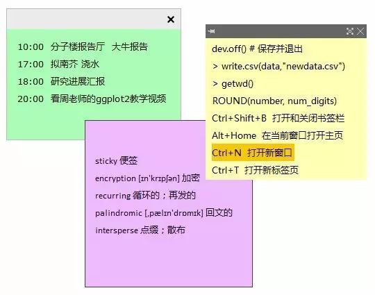 我主要用它來記錄要做的事情,也把需要反復(fù)看才能記住的東西(如英語單詞,新學(xué)的快捷鍵,編程的語法、命令、函數(shù)等等)以便簽的形式貼在桌面上,直到爛熟于心為止。