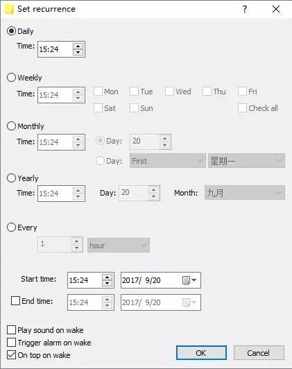 也可以在Sleep菜單下的Recurring,設(shè)置周期性的提醒,如下圖每周上午十點半的例會的提醒可以這樣設(shè)置(見下圖)。注意:在“Trigger alarm on wake”前打鉤。