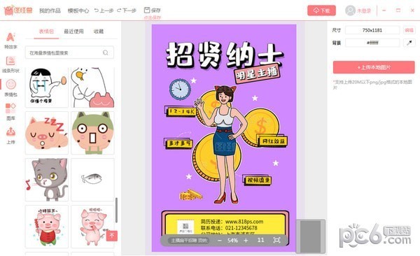 文字更換完畢后又可以在左側(cè)增加特效字、線條形狀和表情包等操作;如果自己有本地的圖片也可以通過上傳來對圖片進(jìn)行相對應(yīng)的設(shè)計;