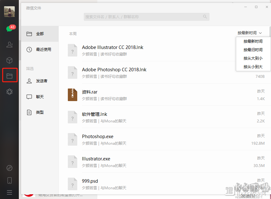 想查看自己都傳輸接收了哪些文件,這里我們點(diǎn)擊文件圖標(biāo),就可以快速查看所有接受發(fā)送過的文件了,而且連文件日期,以及發(fā)送者是誰,都標(biāo)注的清清楚楚。甚至你還可以按照時(shí)間及大小來快速篩選文件。