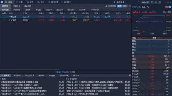 我們可以看到目前軟件有兩個自選股。分別是廣發(fā)證券和上證指數(shù)。我們可以在這里看到自選股的漲跌情況、現(xiàn)價、成交量、成交額、換手率等技術(shù)參數(shù);