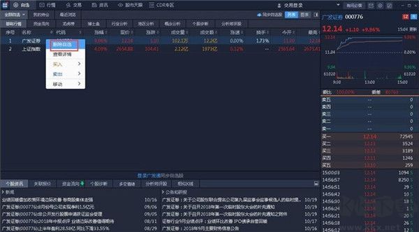 試用一下軟件的刪除自選股功能,將廣發(fā)證券從自選股列表中刪除。用鼠標(biāo)選中廣發(fā)證券,用鼠標(biāo)右鍵點(diǎn)擊廣發(fā)證券,然后點(diǎn)擊右鍵菜單中的刪除自選,就可以將選中的廣發(fā)證券自選股從自選股列表中刪除;
