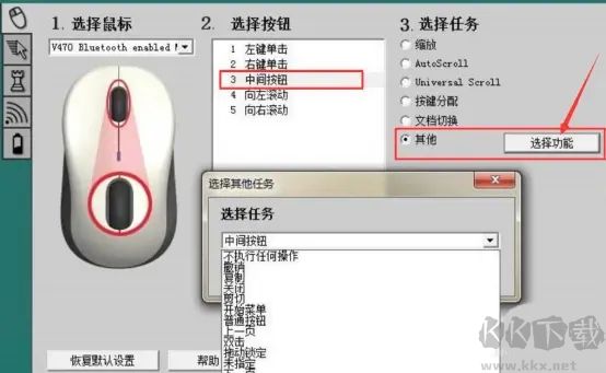 1.首先,進(jìn)入Logitech Setpoint設(shè)置頁面。先設(shè)置鼠標(biāo)按鈕。例如我們選擇“中間按鈕”,點(diǎn)擊“選擇功能”按鈕,彈出“選擇任務(wù)”窗口,根據(jù)自己的需要來設(shè)置該按鈕的動(dòng)作。