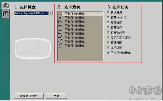 2.然后,我們再設(shè)置Logitech Setpoint的熱鍵和F鍵。先根據(jù)自己需要選擇熱鍵,再設(shè)置它對(duì)應(yīng)的任務(wù)選項(xiàng)。同樣的,切換至F鍵的設(shè)置頁面,也可以為它選擇相應(yīng)的任務(wù)。
