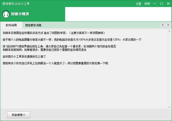 微信群發(fā)2021小工具是一款采用固定坐標(biāo)模擬點(diǎn)擊的方式,省去了找圖的辛苦。該工具脫離按鍵精靈,基于之前吾愛(ài)前輩發(fā)過(guò)的找圖方式,經(jīng)過(guò)測(cè)試發(fā)現(xiàn)可以通過(guò)固定坐標(biāo)方式來(lái)進(jìn)行群發(fā),同時(shí)基于按鍵精靈開(kāi)發(fā)的腳本工具,幫助在電腦中使用微信的用戶可以輕松的進(jìn)行消息群發(fā)!