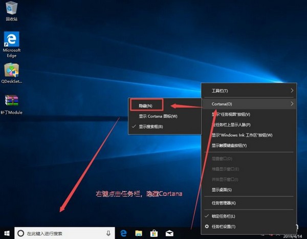 1、首先隱藏任務(wù)欄的Cortana,因為小Q書桌的圖標(biāo)還是會覆蓋在cortana上,在任務(wù)欄單擊右鍵,選擇小娜,隱藏,如下圖所示: