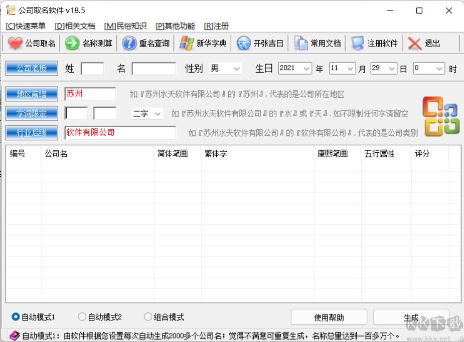 公司起名軟件結(jié)合公司老板姓氏、性別、生辰八字、天格、地格、人格、外格、總格、三才數(shù)理、五行元素、好聽等多種因素,真正為您的新公司取到評(píng)分高、數(shù)理吉祥的好名字,讓您的事業(yè)有個(gè)高起點(diǎn)。