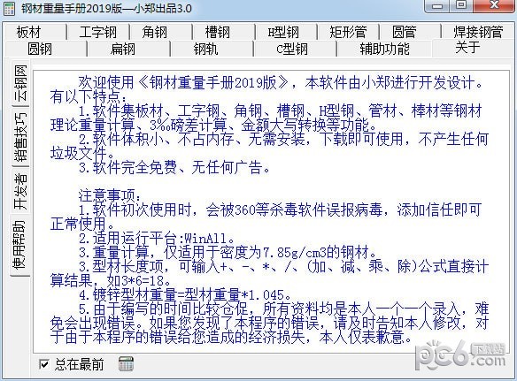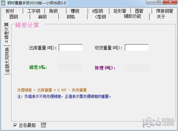 鋼材重量手冊是小鄭出品的元支持鋼板、工字鋼、角鋼、槽鋼、H型鋼、無縫管、鋼管、鋼軌、C型鋼理論重量的計算、磅差處理、金額大寫轉(zhuǎn)換等功能的綠色小工具,體積小功能強,可以用于計算查詢各種鋼材鋼截面特性,公歡迎有需要使用這款鋼材重量計算工具的用戶前來獲?。?/p>