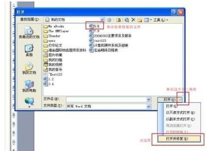 5、單擊這個(gè)三角行,在彈出來的菜單里點(diǎn)“打開并修復(fù)”!
