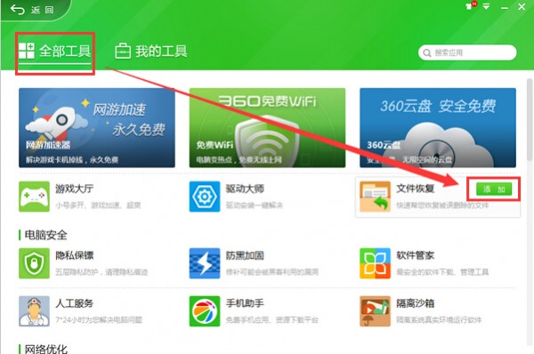 2.切換到全部工具,就可以看到文件恢復(fù),直接點(diǎn)添加即可。
