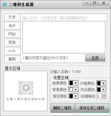 1、下載完畢后,無需安裝,直接打開,選擇文本,輸入信息,設(shè)置模塊大小,顏色,樣式,logo后,再點擊生成;