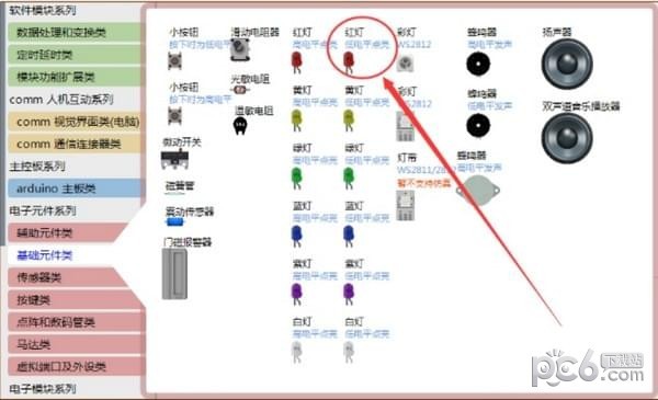 指示燈模塊在電子元件系列里邊的基礎(chǔ)元件類,共有紅黃綠藍(lán)紫和白等6種顏色的指示燈,選擇一個(gè)指定顏色的燈,鼠標(biāo)左鍵點(diǎn)擊可以添加到編程界面中