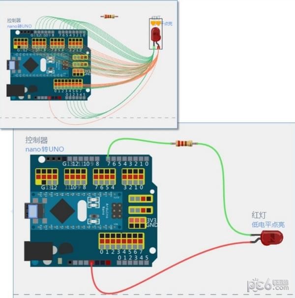 指示燈模塊拖進(jìn)來后我們需要把它和主控板連接起來。鼠標(biāo)放到指示燈模塊的端口上,界面會(huì)給出提示線條,根據(jù)提示線條任意連接即可。