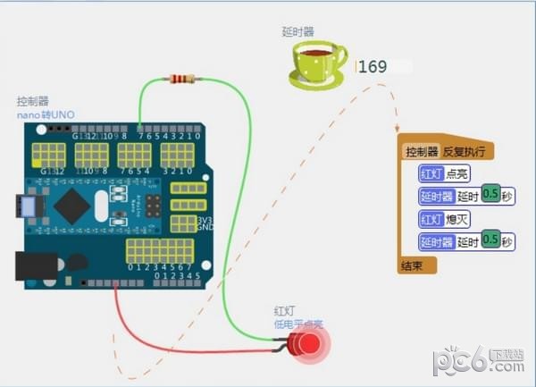 LED指示燈不能直接連接到主板上,需要通過一個(gè)限流電阻降低電流。限流電阻在電子元件系列里邊的輔助元件類,共有限流電阻和分壓電阻兩種。鼠標(biāo)左鍵點(diǎn)擊可以添加到編程界面中
