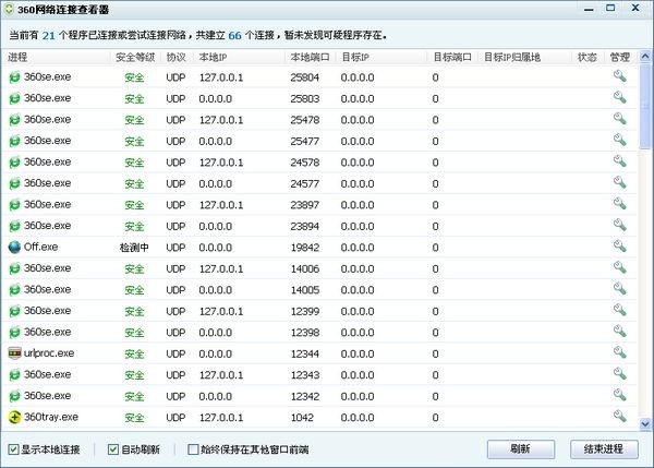 360網(wǎng)絡(luò)連接查看器是一款從360安全衛(wèi)士里單獨提取出來的,用它可以來查看電腦中所有進程的端口,安全等級,協(xié)議,本地IP等信息,讓你確保電腦中軟件都是正常的。