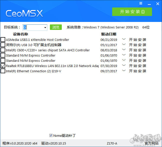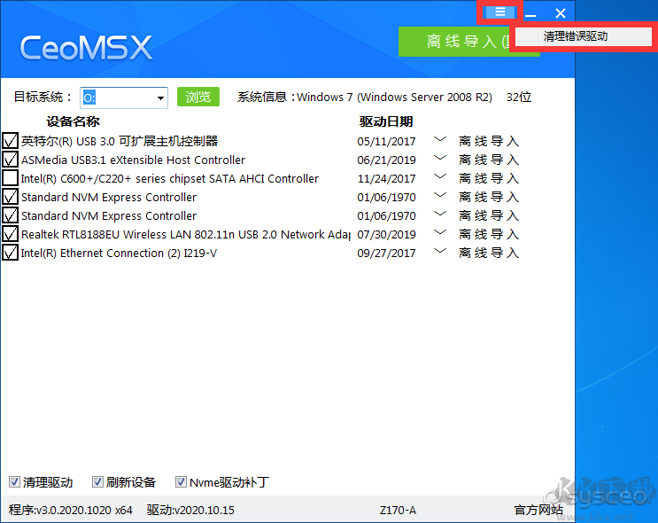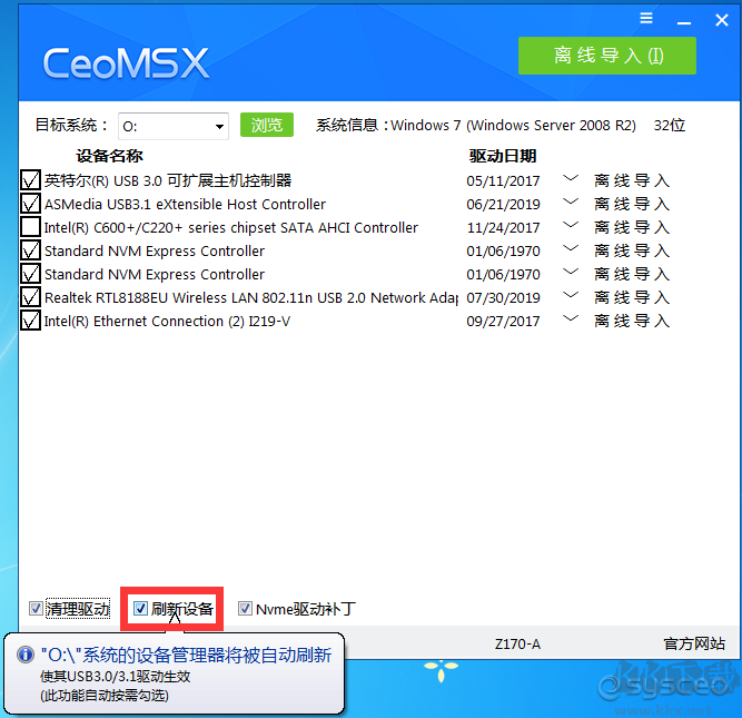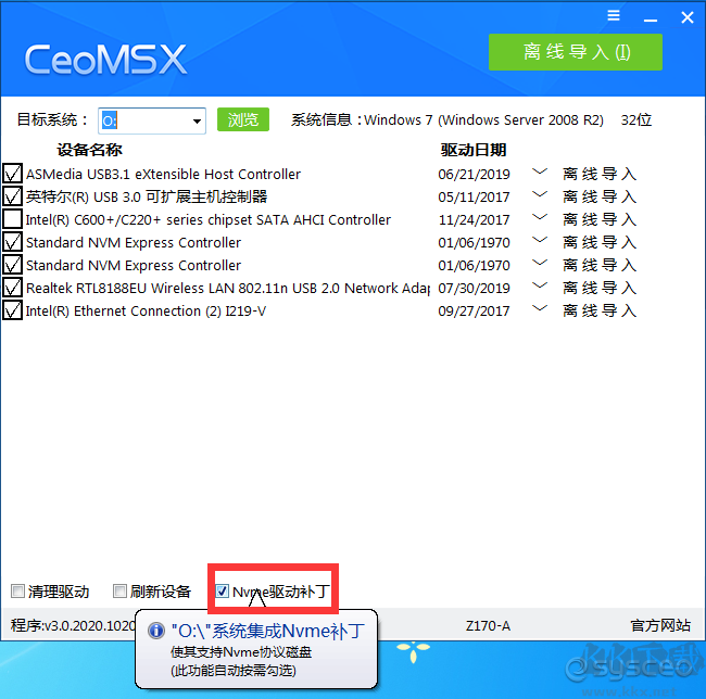 特別注意使用前提:其中USB3.0/3.1只對win7做完整支持,并且只有精確匹配方案無通用方案,原因intel usb3.0分版本。已經(jīng)安裝好的系統(tǒng),導(dǎo)入USB3.0/3.1驅(qū)動可能無法直接生效,需要觸發(fā)設(shè)備管理器的自動刷新。因此建議在系統(tǒng)開始部署之前就導(dǎo)入,也就是說你如果在PE下裝GHO,在GHO恢復(fù)完就需要用CeoMSX導(dǎo)入USB3.0/3.1驅(qū)動(原版系統(tǒng)請用PE下的安裝工具安裝之后再導(dǎo)入)。